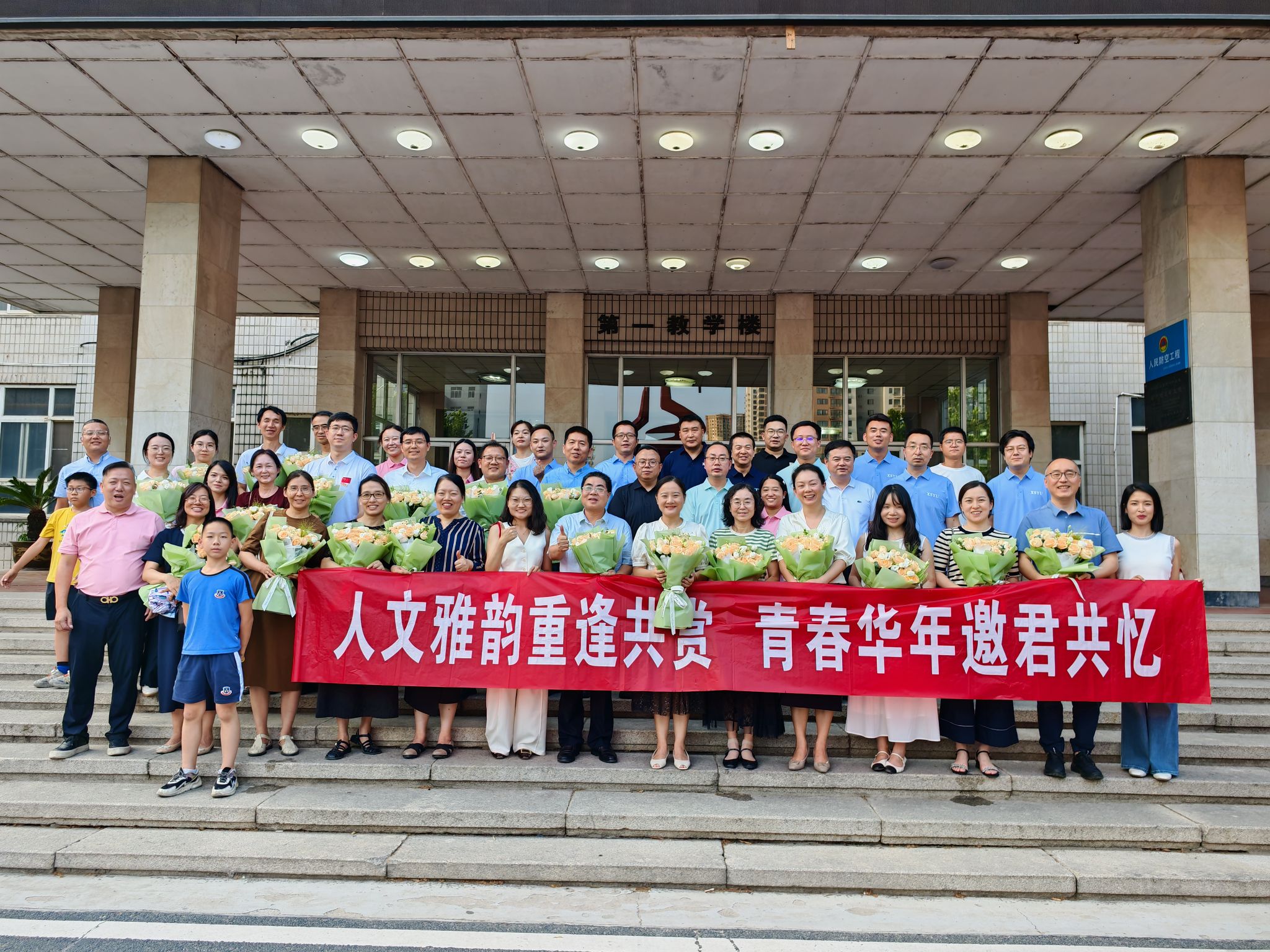 合影。2002級(jí)漢語(yǔ)言文學(xué)專業(yè)校友代表劉凱揚(yáng)為全體教師獻(xiàn)花,與會(huì)人員在教學(xué)樓前合影留念,鏡頭定格下了這難忘的一刻。每個(gè)人的臉上都洋溢著幸福的笑容,那是對(duì)過去美好時(shí)光的懷念,也是對(duì)未來共同發(fā)展的期待。