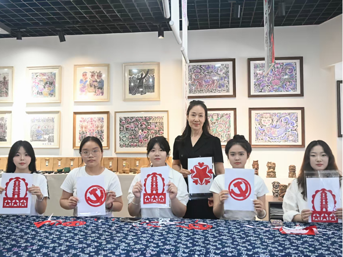 實(shí)踐團(tuán)隊(duì)首站赴信天游民間藝術(shù)展覽館開展實(shí)地調(diào)研,系統(tǒng)深入地學(xué)習(xí)了國(guó)家級(jí)非物質(zhì)文化遺產(chǎn)"延安剪紙"及其衍生藝術(shù)形式熏畫、剪紙畫的歷史淵源與發(fā)展脈絡(luò)。團(tuán)隊(duì)成員與非遺傳承人張寧進(jìn)行了深入交流訪談,并在其悉心指導(dǎo)下開展了剪紙技法實(shí)操訓(xùn)練,切身感受了剪刀與紅紙間所蘊(yùn)含的文化韻律。此次實(shí)踐活動(dòng)得到了延安市當(dāng)?shù)孛襟w的關(guān)注,通過(guò)媒體傳播不僅有效提升了非物質(zhì)文化遺產(chǎn)的時(shí)代影響力,更引發(fā)了社會(huì)各界對(duì)傳統(tǒng)文化創(chuàng)造性轉(zhuǎn)化、創(chuàng)新性發(fā)展的深入思考——當(dāng)千年剪紙紋樣與革命圣地精神深度融合,中華文明的根脈與紅色文化的精神脈絡(luò)在剪紙藝術(shù)中實(shí)現(xiàn)了有機(jī)統(tǒng)一與創(chuàng)新發(fā)展。