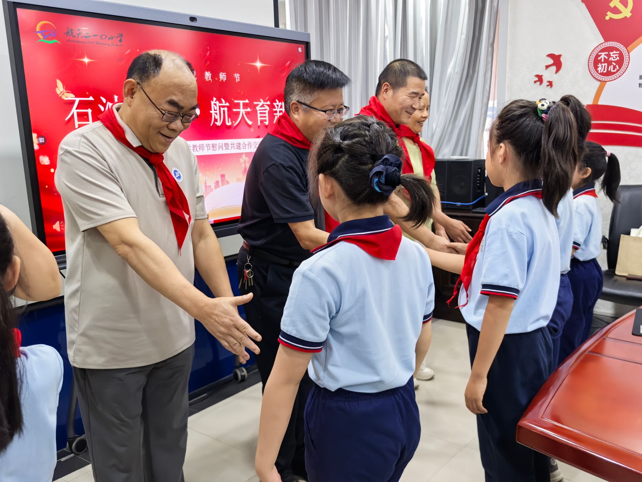 慶祝教師節(jié)活動上,航天210小學(xué)的少先隊員代表為張驍勇一行敬獻了紅領(lǐng)巾。活動結(jié)束后,雙方就合作共建的具體事項進行了深入交流。