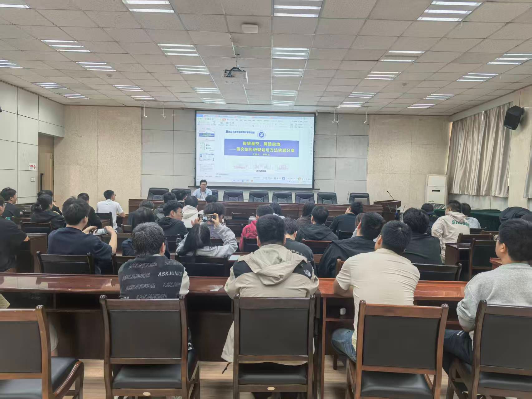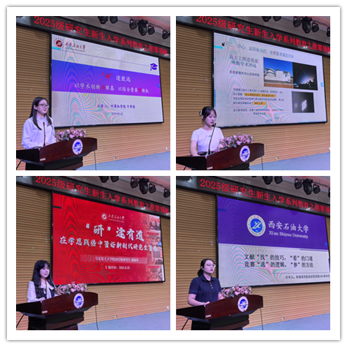 雁塔校區(qū)會場上,來自石油工程學院的博士羅開慶以《仰望星空,腳踏實地——研究生科研規(guī)劃與方法實踐分享》為題,結合自身從碩士到博士的科研進階經歷,給同學們分享了科研實踐方法建議,希望學弟學妹們在科研學習中勤記錄、善總結,并在此基礎上運用“嫁接法”“轉移法”積極進行科研創(chuàng)新探索。地球科學與工程學院博士章鑫以《讓思想落筆,讓創(chuàng)新落地:論文與專利的研途雙翼》為題,從思、構、寫三個方面分享了論文創(chuàng)作的思路和方法,并圍繞想、提、護三個關鍵詞為新生講解了如何進行專利構思、方案提煉以及創(chuàng)新落地。化學化工學院的碩士勇志華以《從“適應”到“起跑”,解鎖論文、競賽與科研生活新節(jié)奏》為題,結合自己的申博經歷用4個優(yōu)先級給新生提出研究生科研學習生活的規(guī)劃建議,同時分享了他悉心整理的AI科研工具集。機械工程學院的碩士張伊晨以《科研競賽齊驅并進,機械學子的突破與成長》為題,分享了她參加科研競賽的三個心法:作品選題、團隊建設、展示表達,總結出強大的技術加出色的表達,將會助力競賽的成功。