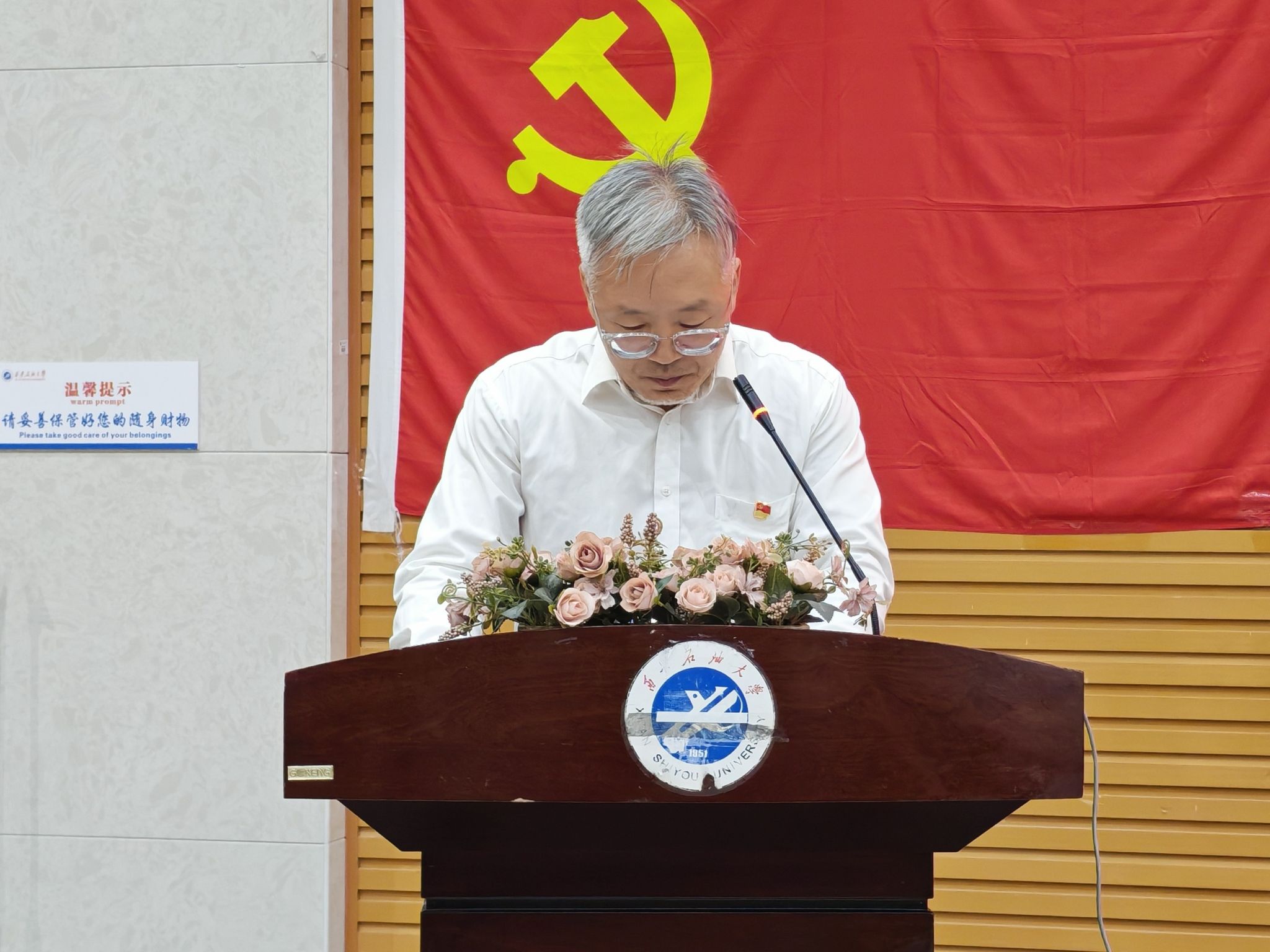 司馬文龍在大會上講話,他總結(jié)了石油工程學(xué)院過去一年黨建工作取得突出成績,肯定了上一學(xué)年各學(xué)生支委和學(xué)生黨建辦公室的辛勤努力,并且對新一屆支委和學(xué)生黨建辦公室提出了四點要求,一是堅持政治忠誠,做聽黨話、跟黨走的大學(xué)生。石油工程學(xué)院學(xué)生黨員要深刻理解習(xí)近平總書記關(guān)于能源的飯碗必須端在自己手里的重要論述,將個人的石油夢融入國家能源安全的大潮流中。二是錘煉過硬本領(lǐng),做立大志、成大才的大學(xué)生。作為西安石油大學(xué)主干專業(yè)的學(xué)生,必須將理論學(xué)習(xí)與實踐創(chuàng)新結(jié)合,夯實專業(yè)基礎(chǔ),在實踐中提升創(chuàng)新能力。三是厚植服務(wù)情懷,做能吃苦、擔(dān)重任的大學(xué)生。石油工程學(xué)院學(xué)生黨員必須要牢記服務(wù)學(xué)院、服務(wù)同學(xué)的宗旨,在學(xué)風(fēng)建設(shè)、志愿服務(wù)、日常生活中當(dāng)好示范員、宣傳員、聯(lián)絡(luò)員,在學(xué)院的重要工作、重要時間節(jié)點做好服務(wù)員、主力軍、攻堅隊。四是弘揚(yáng)優(yōu)良作風(fēng),做守規(guī)矩、樹正氣的大學(xué)生。要嚴(yán)守政治紀(jì)律和政治規(guī)矩,在考風(fēng)學(xué)風(fēng)、網(wǎng)絡(luò)言行、集體生活中發(fā)揮先鋒模范作用,尤其要在科研誠信、學(xué)風(fēng)建設(shè)中立標(biāo)桿、作表率,以一身正氣、兩袖清風(fēng)的品格擦亮石油工程學(xué)院學(xué)生黨員底色。