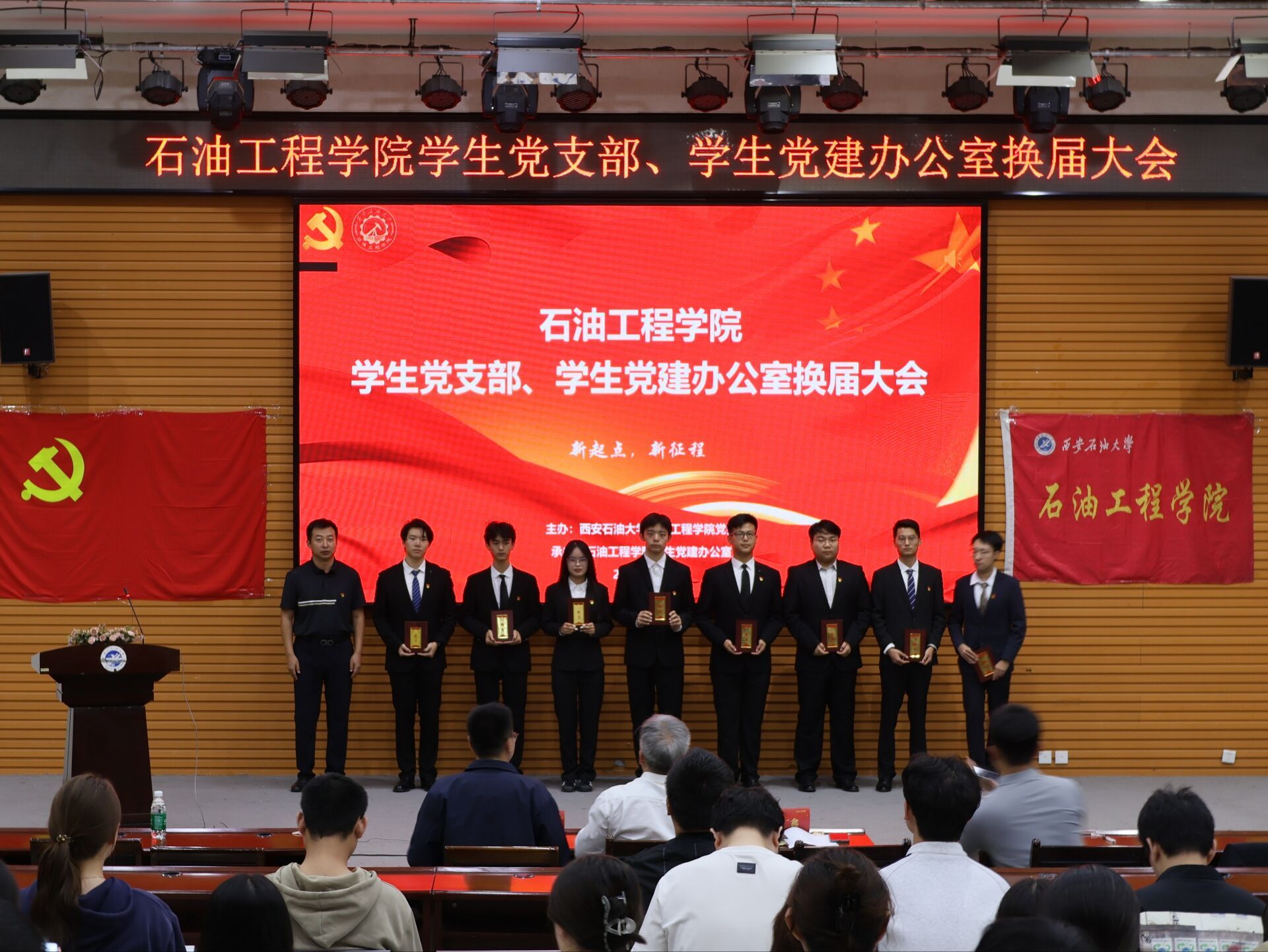 司馬文龍、艾二鑫、宋興淼為新一屆各學(xué)生黨支部授旗,艾二鑫為新一屆學(xué)生黨建辦公室干部頒發(fā)聘書。