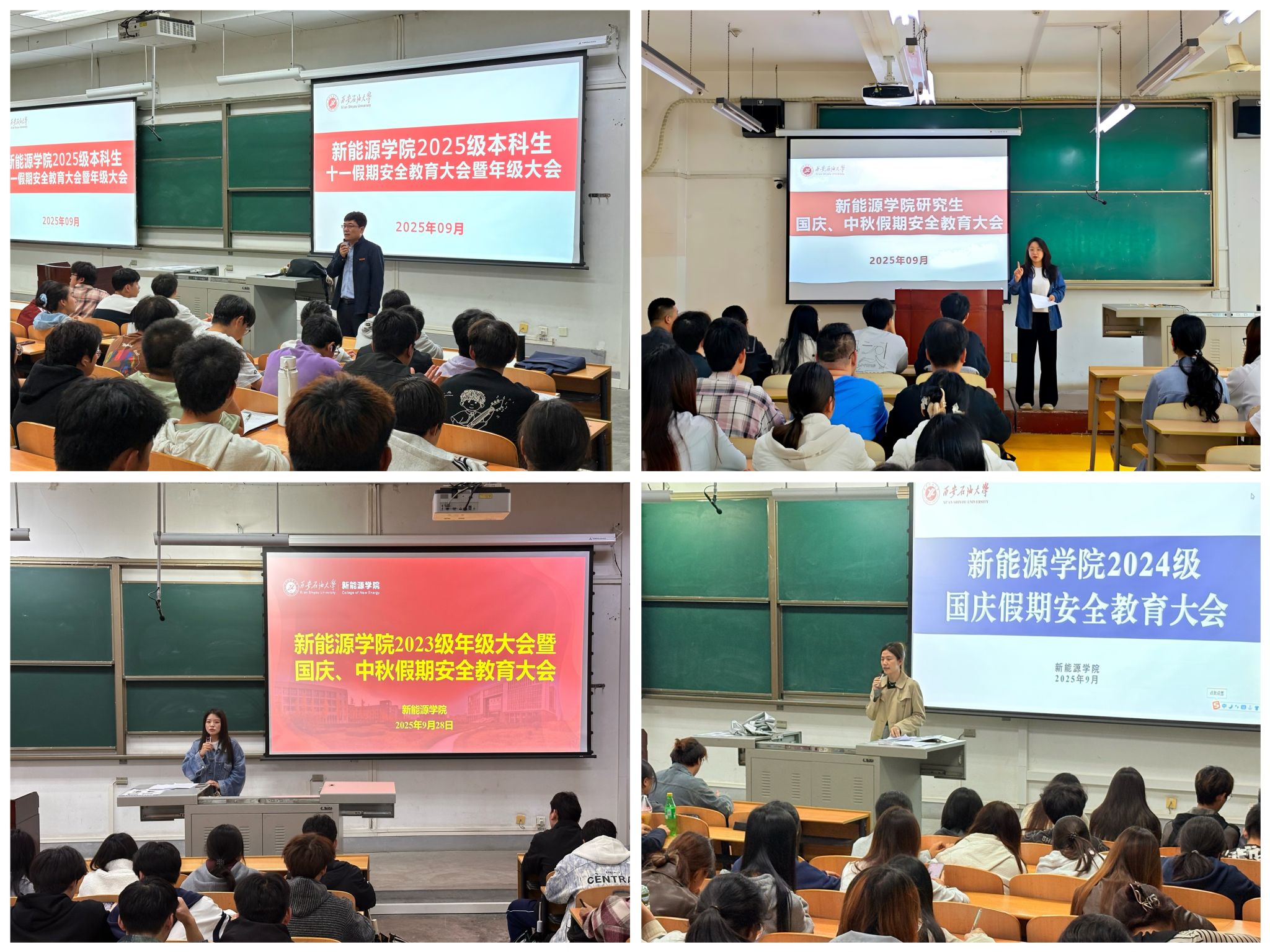 為切實(shí)加強(qiáng)學(xué)院學(xué)生安全教育管理,確保國(guó)慶、中秋雙節(jié)期間安全穩(wěn)定,927日至29日,新能源學(xué)院組織各本科生、研究生年級(jí)分批次召開(kāi)假期安全教育暨年級(jí)大會(huì)。學(xué)院全體學(xué)生在輔導(dǎo)員的組織下全員參與,通過(guò)系統(tǒng)化、全覆蓋的安全教育舉措,筑牢安全管理防線。