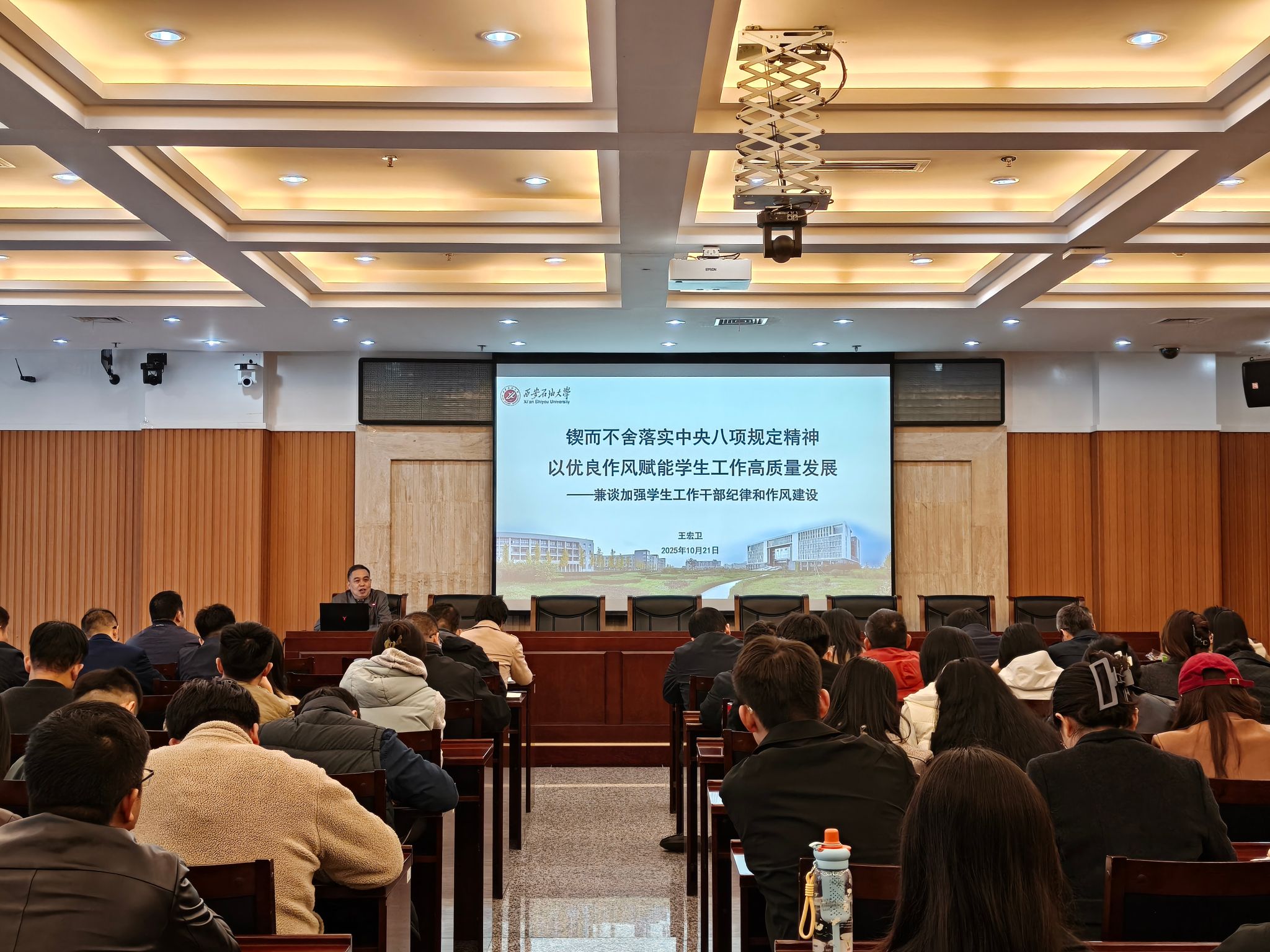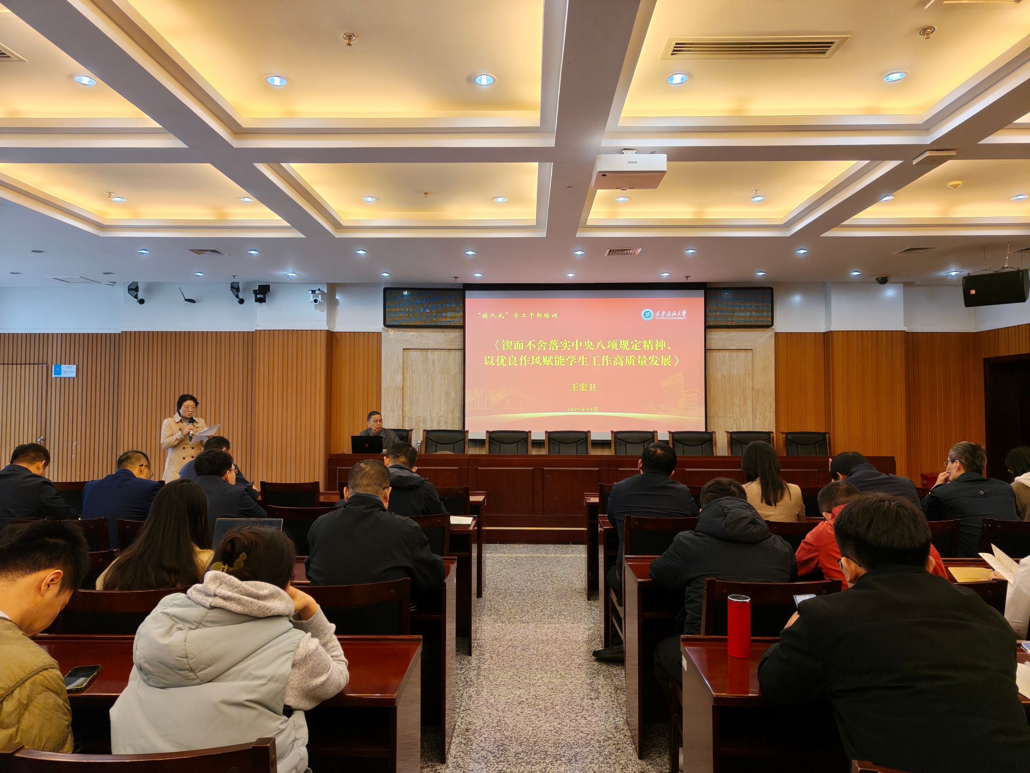 為深入落實(shí)中央八項(xiàng)規(guī)定精神,以優(yōu)良作風(fēng)賦能學(xué)生工作高質(zhì)量發(fā)展,進(jìn)一步強(qiáng)化學(xué)工干部紀(jì)律作風(fēng)建設(shè)與立德樹人履職盡責(zé)能力2025年10月21日下午,學(xué)生工作部在鄠邑校區(qū)第一會議室舉辦“鐵人式”學(xué)工干部專題培訓(xùn)第六講。校紀(jì)委副書記王宏衛(wèi)受邀作題為《鍥而不舍落實(shí)中央八項(xiàng)規(guī)定精神,以優(yōu)良作風(fēng)賦能學(xué)生工作高質(zhì)量發(fā)展》的專題報告,報告由學(xué)生工作部副部長畢軼慧主持,全體學(xué)工干部參加。