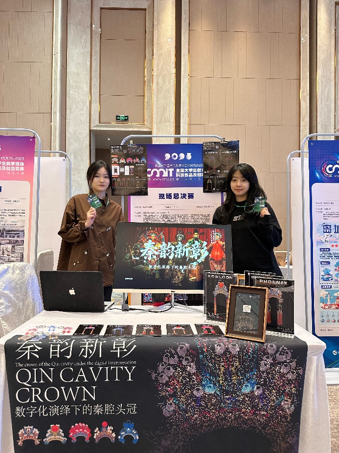 在高手云集的全國(guó)總決賽現(xiàn)場(chǎng),我校學(xué)子憑借將傳統(tǒng)文化與數(shù)字技術(shù)深度融合的創(chuàng)新設(shè)計(jì)脫穎而出。由何奇穎老師指導(dǎo),藝碩2402班史文婧、王翼鵬同學(xué)完成的作品《秦韻新彰——數(shù)字化演繹下的秦腔頭冠》,聚焦“數(shù)字藝術(shù)表現(xiàn)”,通過分層設(shè)計(jì)與動(dòng)態(tài)粒子效果,讓靜態(tài)的秦腔頭冠煥發(fā)出動(dòng)態(tài)的藝術(shù)生命力。由陳慶老師指導(dǎo),2022級(jí)視覺傳達(dá)設(shè)計(jì)專業(yè)穆子鈺、李義蔓、郭燕子同學(xué)完成的作品《延川丹彩——陜北匠藝丹青紋樣文創(chuàng)設(shè)計(jì)》,則投身于“民族文化創(chuàng)新表達(dá)”專項(xiàng)賽道,對(duì)陜北傳統(tǒng)紋樣進(jìn)行現(xiàn)代轉(zhuǎn)譯,展現(xiàn)了其深厚的文化內(nèi)涵與時(shí)代氣息。