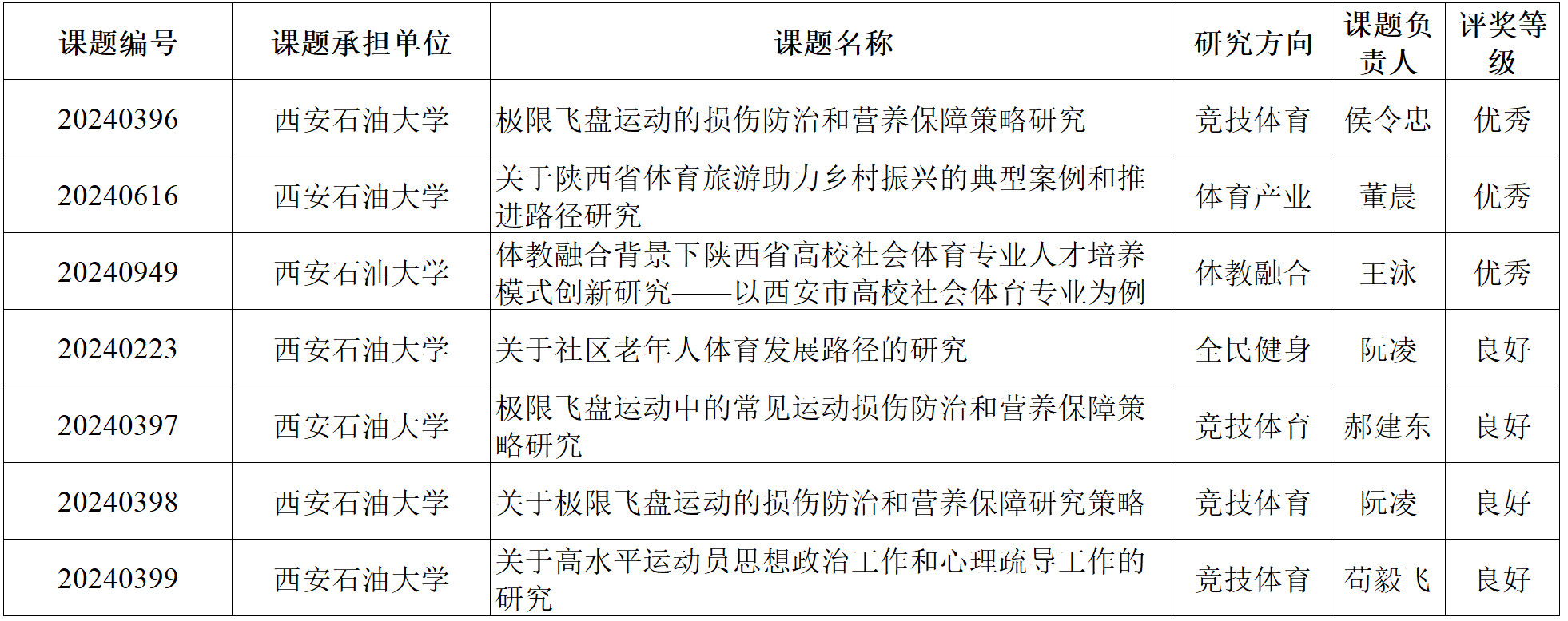 近日,陜西省體育局發(fā)布《陜西省體育局關(guān)于2025年度常規(guī)課題結(jié)題的通知》陜體函〔2025〕183號文件,體育學(xué)院喜獲豐收。經(jīng)評審,學(xué)院共有7項課題通過結(jié)題驗收,其中3項獲評“優(yōu)秀”、4項獲評“良好”。同時,學(xué)院獲批陜西省體育局2025年常規(guī)課題17項。