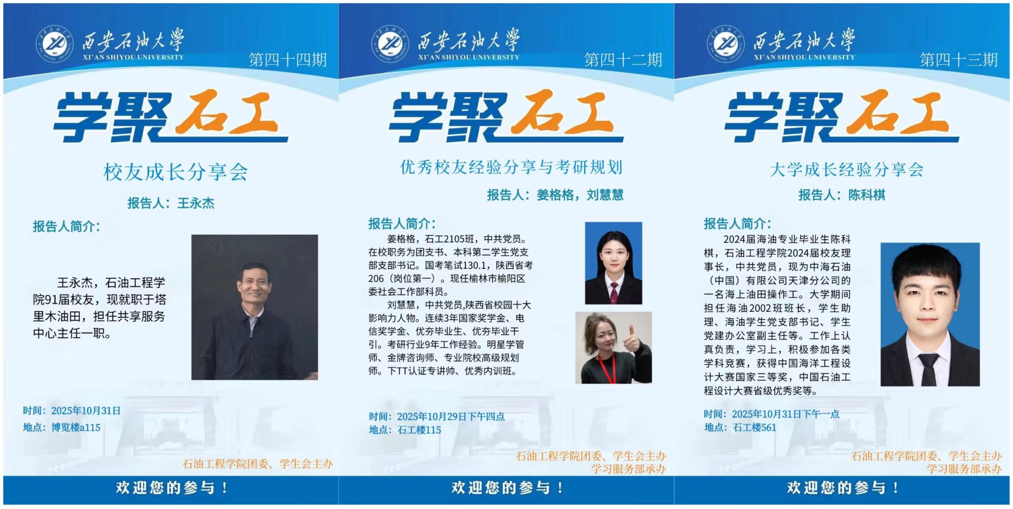 10月31日,學(xué)院邀請(qǐng)石油工程91屆校友王永杰現(xiàn)任塔里木油田共享服務(wù)中心主任),結(jié)合30余年行業(yè)經(jīng)驗(yàn)和人生感悟,與2024級(jí)學(xué)生深入交流“大學(xué)成長(zhǎng)與職業(yè)發(fā)展”;邀請(qǐng)2024屆校友陳科棋(現(xiàn)任職中海石油天津分公司職員)以“海上油田操作工”為例,從學(xué)生工作、求職技巧到職業(yè)發(fā)展路徑,為2023級(jí)學(xué)弟學(xué)妹提供貼近實(shí)際的“定制化”指導(dǎo)