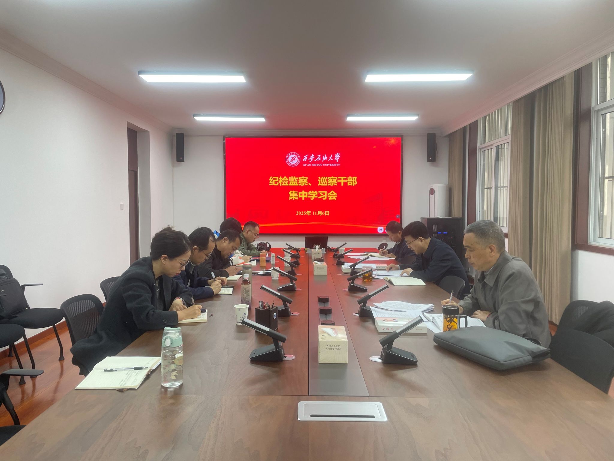 11月6日上午,紀檢巡察干部2025年第20次集中學習會在鄠邑校區(qū)辦公樓第四會議室召開。校黨委副書記、紀委書記、監(jiān)察專員王輝強主持學習會。紀檢監(jiān)察機構(gòu)、黨委巡察工作辦公室全體干部參加會議。