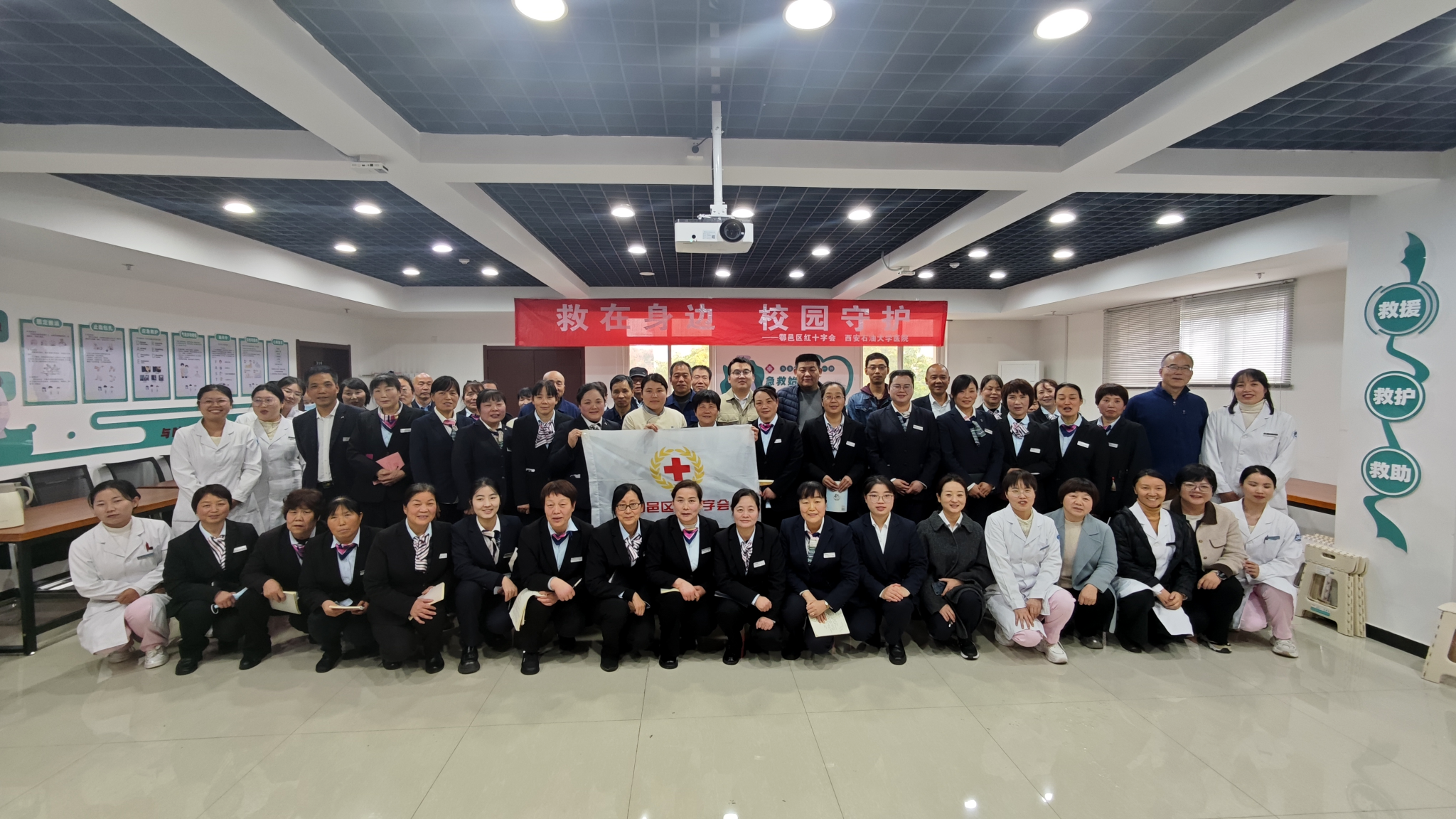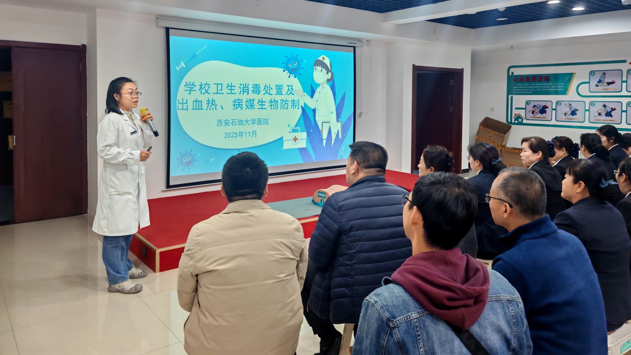 為全面提升校園應(yīng)急保障能力,筑牢師生生命安全防線,夯實(shí)幸福西石大建設(shè)的安全根基,推動(dòng)第三批“急救校園”建設(shè)落地見(jiàn)效,2025年11月5日下午,西安市鄠邑區(qū)紅十字會(huì)、校工會(huì)與校醫(yī)院聯(lián)合開(kāi)展第二期教職工應(yīng)急救護(hù)專(zhuān)項(xiàng)培訓(xùn),40余名教職工(以后勤工作人員為主)踴躍參與,以專(zhuān)業(yè)賦能注入安全動(dòng)能。同步開(kāi)展學(xué)校衛(wèi)生消毒處置及出血熱、病媒生物防治科普講座,以專(zhuān)業(yè)賦能全方位筑牢校園安全防線。