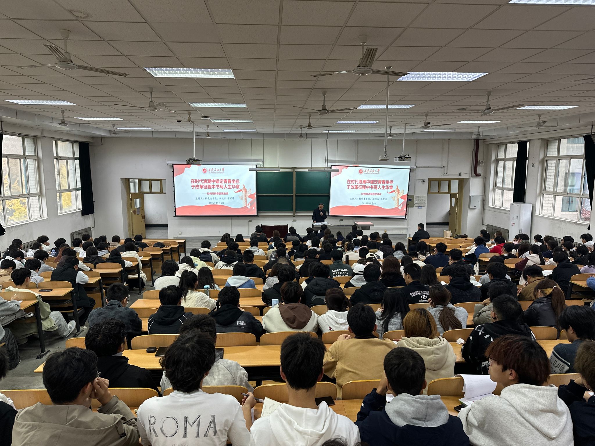 為全面貫徹立德樹人根本任務,將思想政治教育貫穿人才培養(yǎng)全過程,11月5日下午,校黨委委員、副校長張君濤在鄠邑校區(qū)博覽樓234教室為理學院2025級新生講授了題為《在時代浪潮中錨定青春坐標,于改革征程中書寫人生華章》的專題思政課。理學院班子成員、各年級輔導員以及2025級全體新生聆聽了講座。