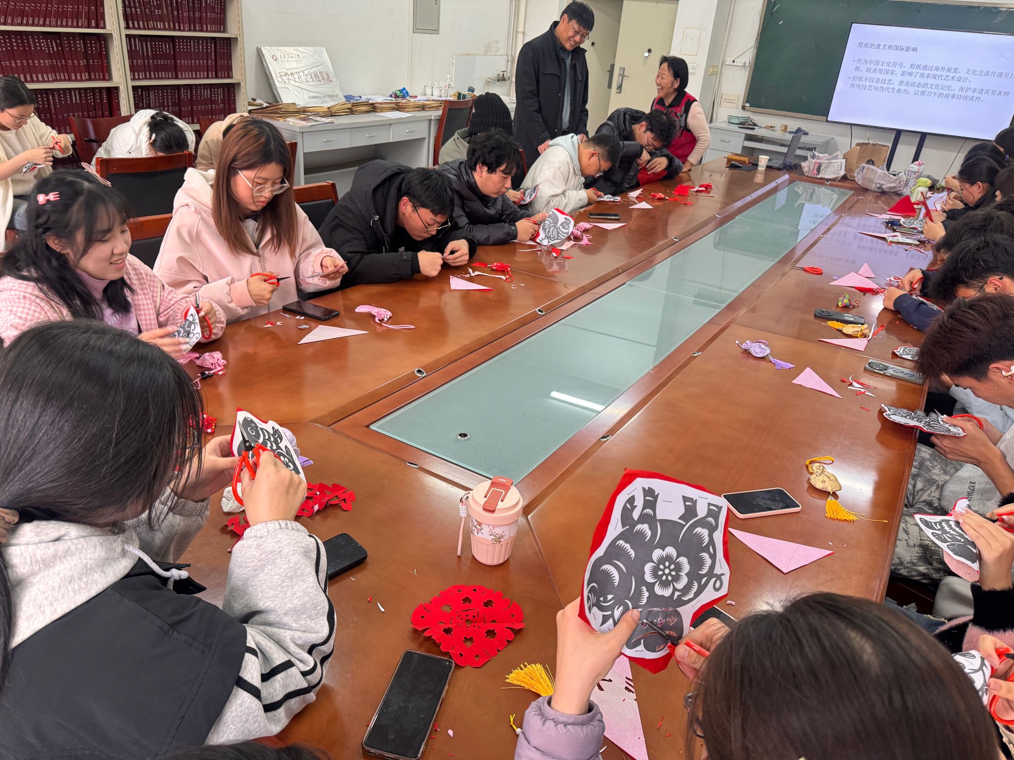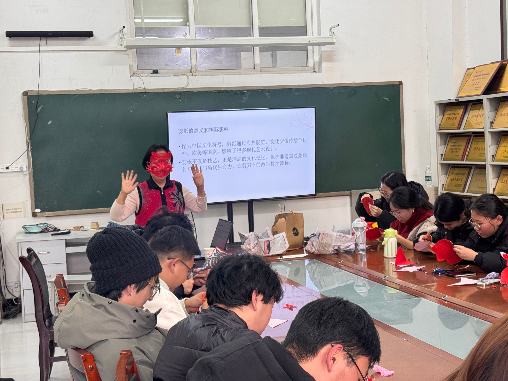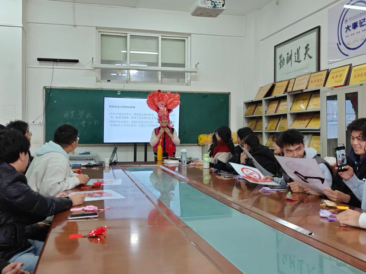 活動現(xiàn)場,78歲的肖志賢老人以輕松幽默的語言和深入淺出的講解,為同學們系統(tǒng)梳理了剪紙藝術(shù)的起源、內(nèi)容與地域特色。從吉祥文字到神話傳說,從十二生肖到花鳥蟲魚,她不僅生動解讀了剪紙背后的民俗信仰與生命禮俗,更以“諧音象征”為例,巧妙串聯(lián)起中國人的生活哲學與樂觀智慧。講解過程中,金句頻出、妙趣橫生,引得現(xiàn)場笑聲不斷,掌聲迭起。