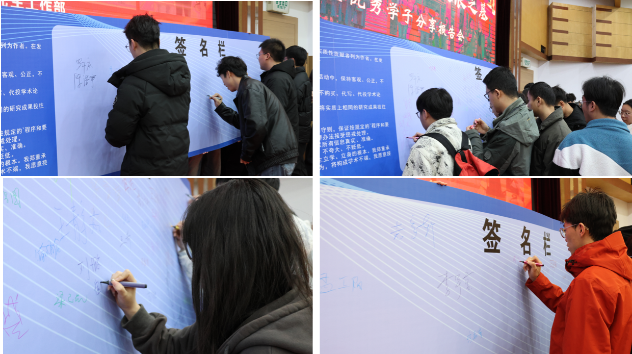 2023級(jí)博士研究生陳浩宇以如何在研究生階段持續(xù)突破自我,樹立學(xué)習(xí)目標(biāo)為主題,向大家講述自己在博士階段從最開始在科研上的迷茫困惑、信心缺失到最后的錨定目標(biāo)、堅(jiān)守篤行的心路歷程,他提出科研道路上一次次的失敗不算真正失敗,而是“科研常態(tài)”,面對這些困境,“心態(tài)破局”和永不言棄尤為重要;2023級(jí)博士研究生羅開慶系統(tǒng)梳理了自己從本科至博士階段的求學(xué)與科研經(jīng)歷,借助“圓圈-兔子”理論,生動(dòng)闡述了本科、碩士與博士三個(gè)學(xué)習(xí)階段在目標(biāo)與要求上的根本差異,寄語大家在專注學(xué)術(shù)的同時(shí)應(yīng)強(qiáng)健體魄、管理情緒、常懷感恩之心,才能在漫長的科研道路上行穩(wěn)致遠(yuǎn);2023級(jí)博士研究生楊靜雯在分享中向大家講述,科研之路從無坦途,真正的突破往往不源于驚天動(dòng)地的創(chuàng)舉,而是在日復(fù)一日的堅(jiān)持中把簡單做到極致,將重復(fù)做到深入。只有沉心耕耘,才能靜候那場屬于自己的質(zhì)變飛躍;2023級(jí)碩士研究生李宇童和大家分享了學(xué)術(shù)論文撰寫的全過程以及一些研究生階段實(shí)用的學(xué)習(xí)方法,并建議大家面對科研要從小處著手、敢于嘗試;2023級(jí)碩士研究生詹文林向大家分享自己關(guān)于學(xué)科競賽的思考與實(shí)踐,她建議同學(xué)們學(xué)會(huì)精準(zhǔn)擇賽,建立系統(tǒng)化解決問題的思維模式,從而提升參賽效率,通過突破自身舒適區(qū)實(shí)現(xiàn)自我的真正的成長。