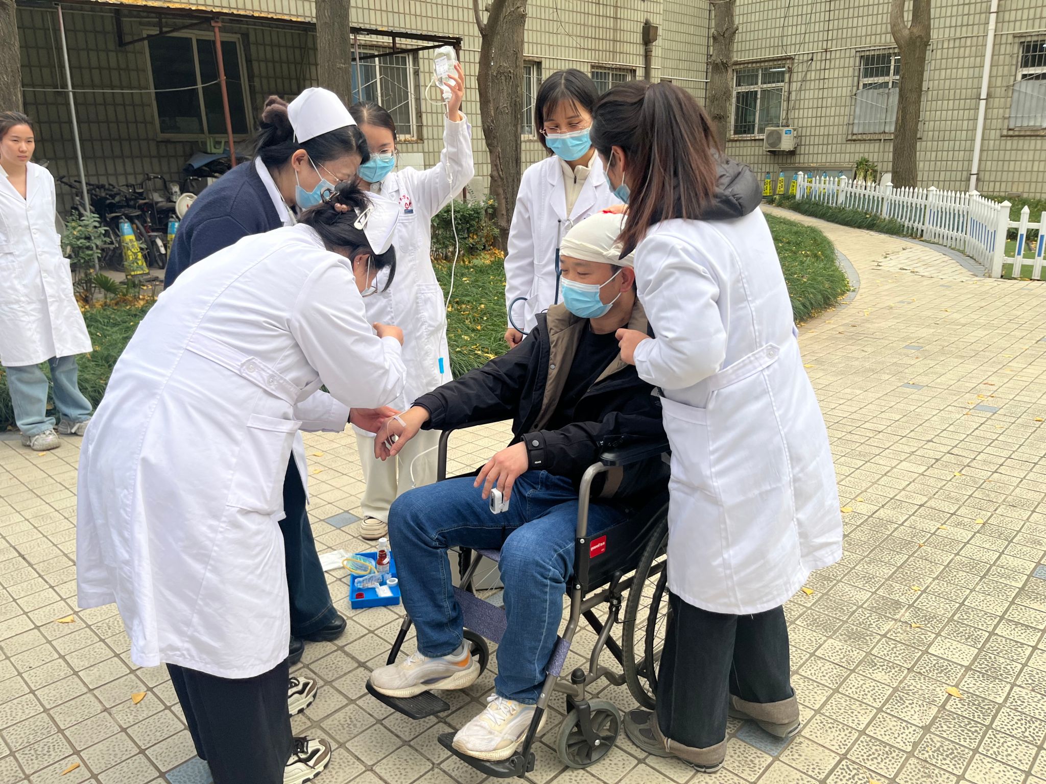 與此同時,疏散引導(dǎo)人員快速打開安全出口,引導(dǎo)就診患者及醫(yī)護(hù)人員用濕毛巾捂住口鼻,彎腰低姿沿預(yù)定疏散路線快速撤離。針對行動不便的模擬患者,工作人員采用攙扶、輪椅轉(zhuǎn)運(yùn)等方式全程協(xié)助,做到不推擠、不遺漏,確保所有人員在規(guī)定時間內(nèi)安全撤離至室外指定集合點(diǎn),各小組隨即快速清點(diǎn)人數(shù)并向指揮部匯報(bào)。醫(yī)院應(yīng)急醫(yī)療小組同步在疏散現(xiàn)場搭建臨時救護(hù)點(diǎn),丁麗團(tuán)隊(duì)全力協(xié)助醫(yī)療演練開展,配合做好救護(hù)物資轉(zhuǎn)運(yùn)、模擬患者傷情配合、救治現(xiàn)場輔助等工作,助力醫(yī)療小組高效完成傷口處理、吸氧、頭部包扎等緊急救治流程,充分彰顯醫(yī)療應(yīng)急處置的專業(yè)性與團(tuán)隊(duì)協(xié)作的高效性。