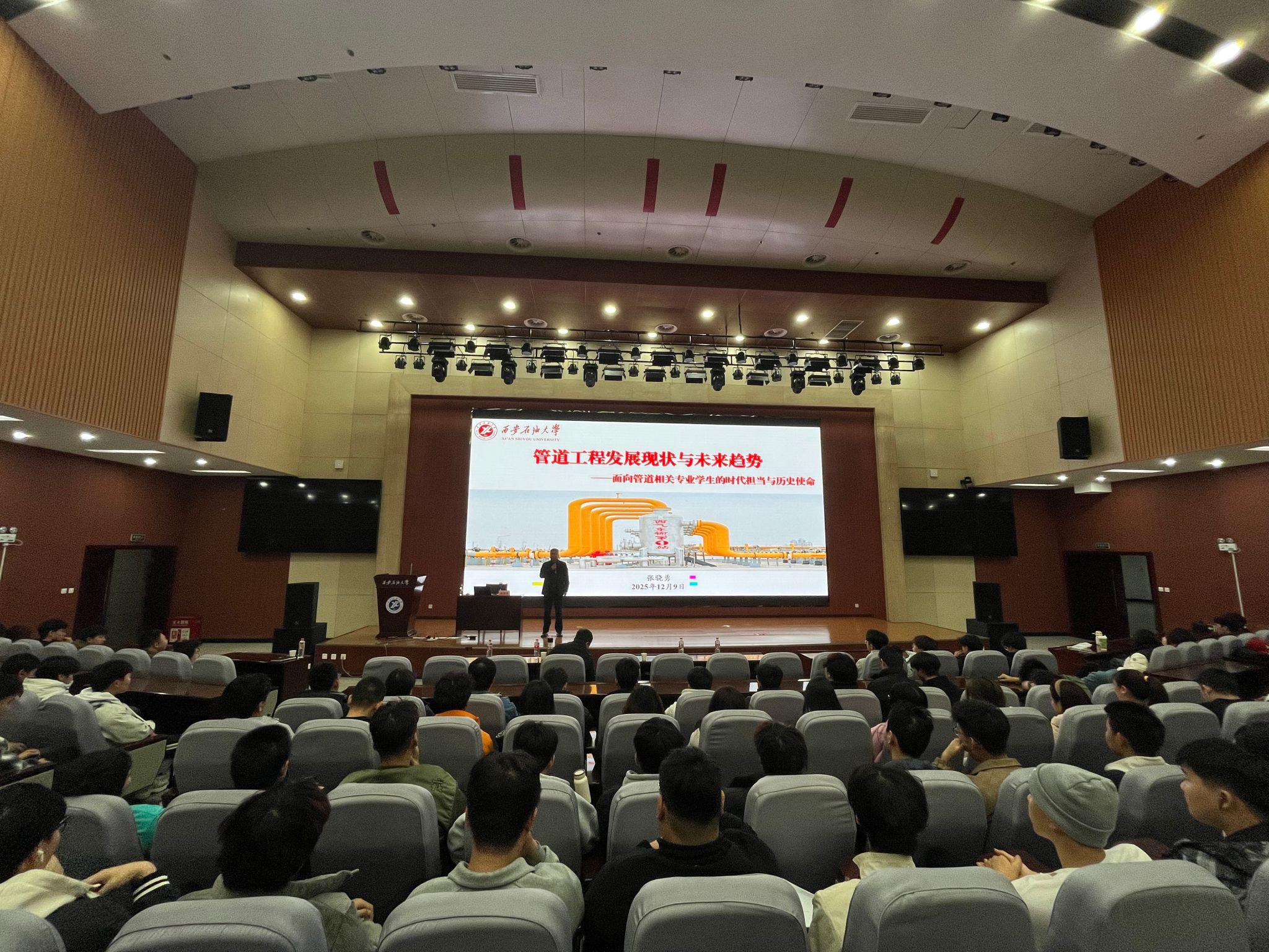 張驍勇以宏闊的全球視野和深遠(yuǎn)的戰(zhàn)略眼光,圍繞“全球能源發(fā)展現(xiàn)狀”“國外管道工程領(lǐng)域現(xiàn)狀”“國內(nèi)管道工程領(lǐng)域發(fā)展情況”“管道工程領(lǐng)域未來發(fā)展趨勢”“管道學(xué)子的使命擔(dān)當(dāng)”等五個(gè)方面展開授課。他援引大量前沿?cái)?shù)據(jù)與典型案例,生動(dòng)解讀了全球能源格局深刻調(diào)整與能源結(jié)構(gòu)轉(zhuǎn)型的時(shí)代趨勢,系統(tǒng)梳理了國際管道建設(shè)的戰(zhàn)略布局與通道格局,深情回顧了我國管道事業(yè)從無到有、由弱圖強(qiáng)的奮斗征程,特別強(qiáng)調(diào)了以“八三”精神為代表的優(yōu)良傳統(tǒng)如何鑄就行業(yè)脊梁、激勵(lì)一代代管道人砥礪前行。他指出,管道作為國家能源戰(zhàn)略通道與國民經(jīng)濟(jì)動(dòng)脈,其重要性日益凸顯。當(dāng)前,管道工程相關(guān)學(xué)科正朝著綠色化、智能化、融合化的方向加速演進(jìn),并且分享介紹了國家管網(wǎng)集團(tuán)在“多介質(zhì)靈活輸送”“新型材料與高效建設(shè)”“數(shù)字孿生與智能運(yùn)輸”、“量子技術(shù)融合”“大型管網(wǎng)仿真和優(yōu)化”“本質(zhì)安全”“標(biāo)準(zhǔn)化與體系重構(gòu)”等七大關(guān)鍵領(lǐng)域的攻關(guān)方向,這些前沿領(lǐng)域既代表了國家重大戰(zhàn)略需求,也為同學(xué)們成長成才提供了前所未有的時(shí)代機(jī)遇與歷史舞臺。
