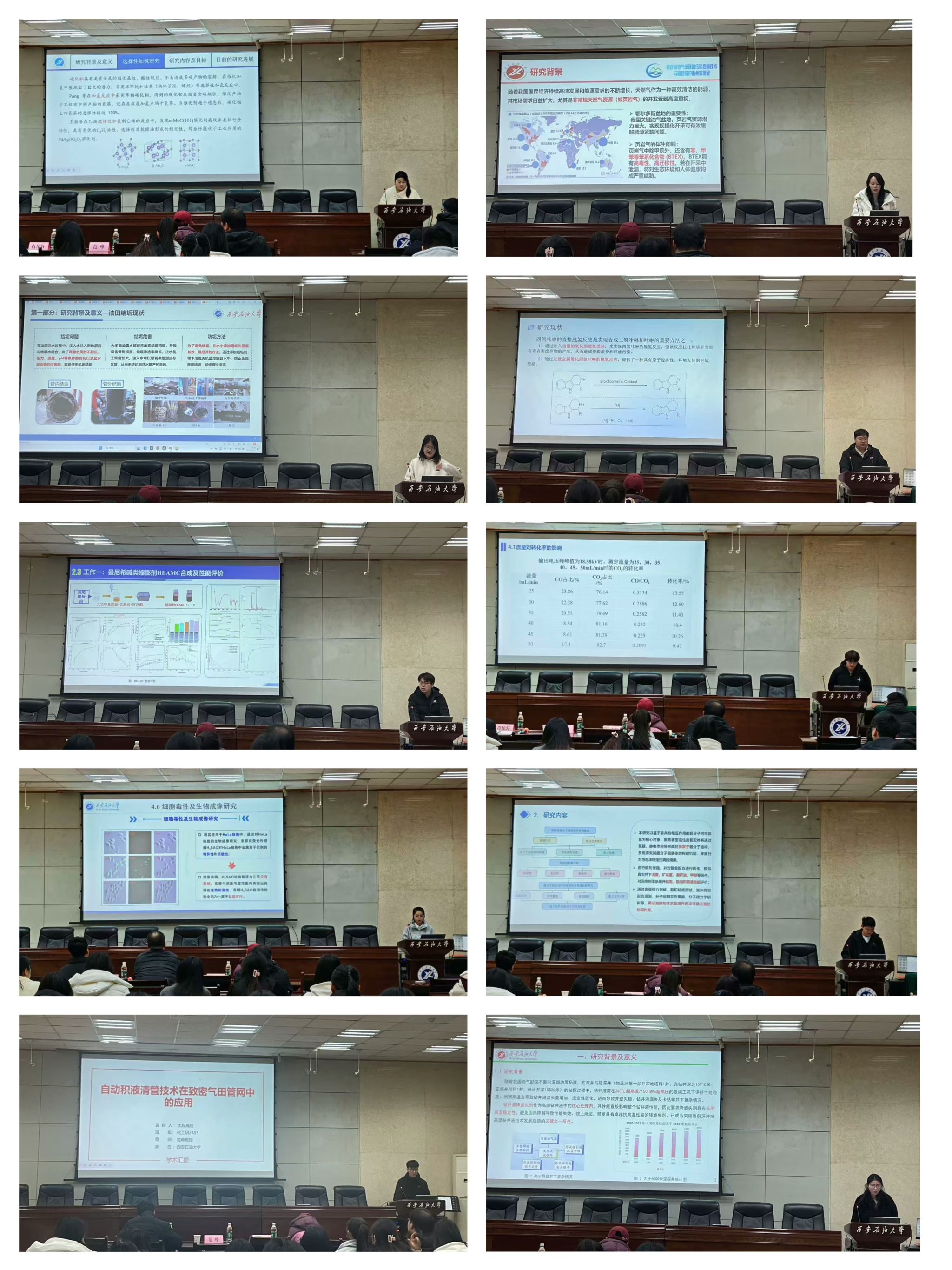 面向國(guó)家能源安全重大需求,多位研究生的研究聚焦油氣資源綠色高效開(kāi)發(fā)領(lǐng)域。沈段高翔同學(xué)介紹的“自動(dòng)積液清管技術(shù)在致密氣田管網(wǎng)中的應(yīng)用”,展現(xiàn)了化學(xué)工程與多學(xué)科交叉融合解決實(shí)際工程難題的能力。肖佳軒老師特別關(guān)注研究的數(shù)據(jù)支撐,詢問(wèn)“核心數(shù)據(jù)集的來(lái)源”,強(qiáng)調(diào)工程應(yīng)用研究必須以可靠數(shù)據(jù)為基石。