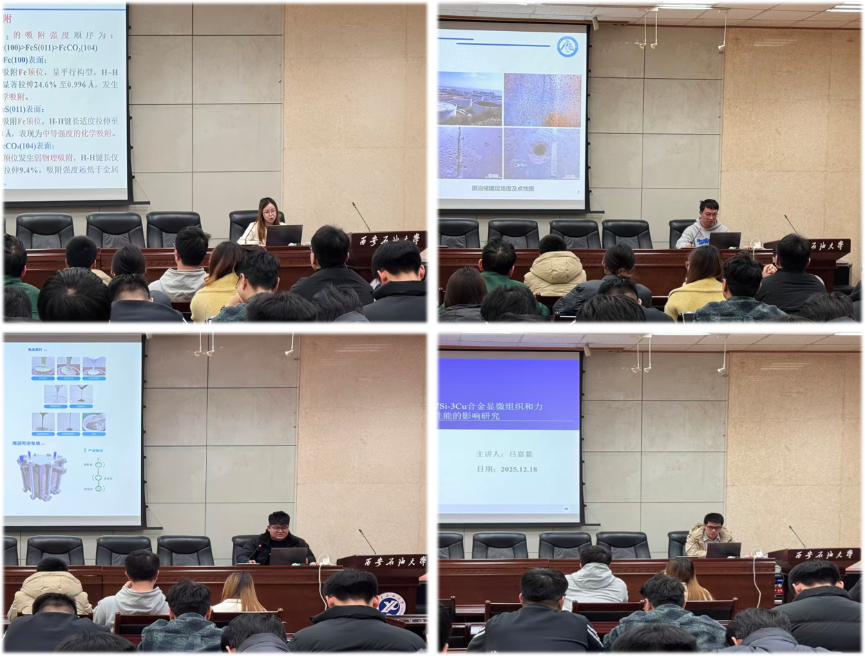 論壇中,四位主持創(chuàng)新基金項(xiàng)目的2023級(jí)碩士研究生,結(jié)合各自立項(xiàng)課題進(jìn)行了系統(tǒng)匯報(bào)與深度分享。安海娟從原子尺度揭示了氫在管線(xiàn)鋼表面的吸附機(jī)制;劉洢辰聚焦微生物腐蝕,探索基于生物競(jìng)爭(zhēng)的綠色抑腐路徑;肖輝致力于開(kāi)發(fā)高熵鈣鈦礦材料,以提升固體氧化物燃料電池的陰極性能;呂嘉鰲研究了陶瓷增強(qiáng)鋁硅銅合金的顯微組織調(diào)控與力學(xué)性能優(yōu)化。匯報(bào)內(nèi)容覆蓋能源材料、腐蝕防護(hù)以及復(fù)合材料等多個(gè)前沿方向,充分展現(xiàn)了我院研究生在創(chuàng)新基金支持下的科研實(shí)踐能力與創(chuàng)新思維。