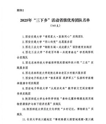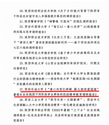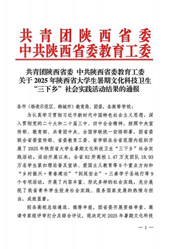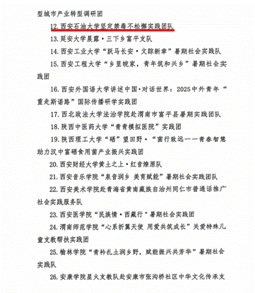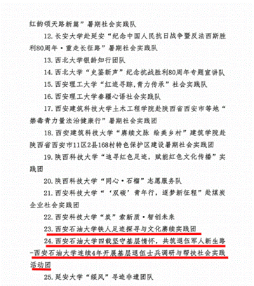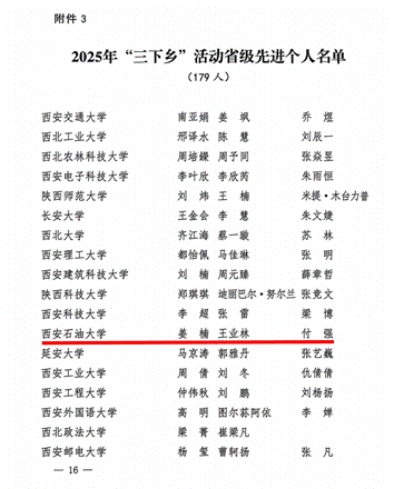 近日,共青團陜西省委、中共陜西省委教育工委在全省范圍內(nèi)組織開展的2025年陜西省大學生暑期文化科技衛(wèi)生“三下鄉(xiāng)”社會實踐活動評選表彰結(jié)果揭曉,我校電子工程學院堅定禁毒不松懈實踐團隊被評為省級標兵團隊,石油工程學院鐵人足跡探尋與文化賡續(xù)實踐團、機械工程學院四載堅守基層情懷,共筑退伍軍人新生路—西安石油大學連續(xù)4年開展基層退伍士兵調(diào)研與幫扶社會實踐活動團被評為省級優(yōu)秀團隊,姜楠、王業(yè)林、付強被評為省級先進個人,馬克思主義學院《童心向黨憶崢嶸薪火相傳愛國情暑假社會實踐團不同階段學生群體的抗戰(zhàn)精神教育調(diào)研報告》被評為省級優(yōu)秀調(diào)研報告,并獲團省委專項資助。