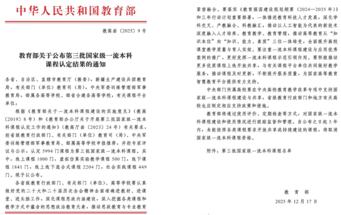 近日,教育部發(fā)布了《教育部關(guān)于公布第三批國家級一流本科課程認(rèn)定結(jié)果的通知》(教高函〔2025〕9號),我院2門課程獲得認(rèn)定,實現(xiàn)了課程建設(shè)的歷史性突破。“大學(xué)英語”課程同時獲批國家級線上一流本科課程與國家級線上線下混合式一流本科課程。截至目前,我院共獲批國家級一流本科課程2門、省級課程建設(shè)項目9門。