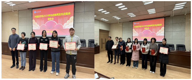 在述職述廉會議之后,學(xué)院召開2025年先進教師和先進集體的表彰大會,陳武宣讀了《外國語學(xué)院關(guān)于公布2025年度先進教師及先進集體評選結(jié)果的通知》,對在教育教學(xué)、科學(xué)研究、人才培養(yǎng)、管理服務(wù)等工作中表現(xiàn)突出的4個先進集體和29名先進教師予以隆重表彰。學(xué)院黨政領(lǐng)導(dǎo)和工會主席為獲獎集體與個人頒發(fā)榮譽證書,陳武向受表彰的先進集體和先進教師表示熱烈祝賀,他們身上愛崗敬業(yè)、甘于奉獻的精神,值得全體教師學(xué)習(xí)借鑒,全體教師要以先進為標桿、以榜樣為力量、主動對標看齊,為學(xué)院發(fā)展貢獻自己的力量。