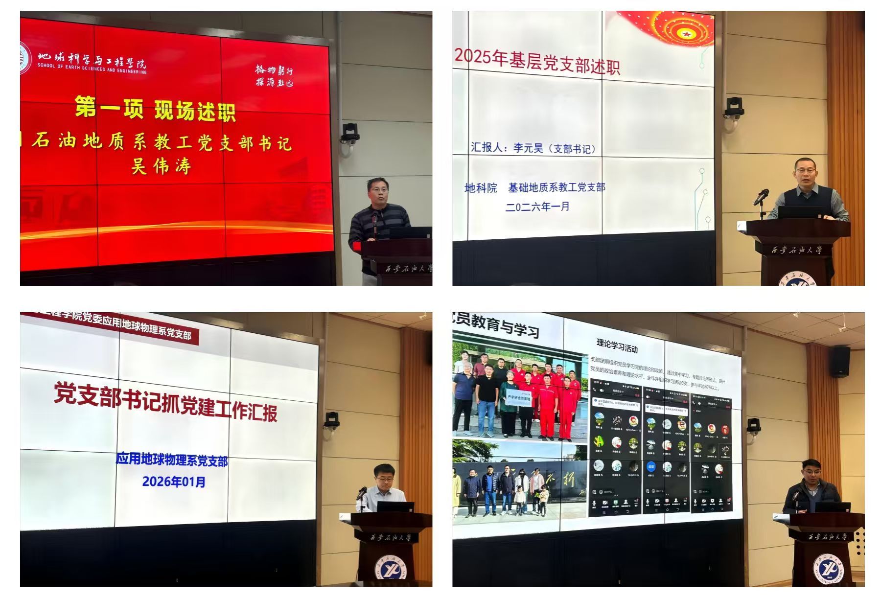會(huì)上,石油地質(zhì)系、基礎(chǔ)地質(zhì)系、應(yīng)用地球物理系、地質(zhì)工程系4個(gè)教工黨支部書記吳偉濤、李元昊、趙軍龍、郭峰等依次進(jìn)行現(xiàn)場(chǎng)述職。各支部書記嚴(yán)格對(duì)標(biāo)履行抓基層黨建第一責(zé)任人職責(zé)要求,圍繞深入學(xué)習(xí)貫徹黨的創(chuàng)新理論、貫徹落實(shí)上級(jí)決策部署、履行全面從嚴(yán)治黨責(zé)任、落實(shí)基層黨建重點(diǎn)任務(wù)、推動(dòng)黨建與中心工作深度融合等方面,全面匯報(bào)了一年來的工作成效,深入剖析存在問題,明確下一步改進(jìn)方向和工作舉措。
