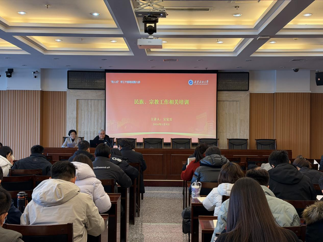 為進(jìn)一步加強(qiáng)學(xué)工干部隊(duì)伍建設(shè),提升我校民族宗教工作規(guī)范化水平,筑牢校園意識(shí)形態(tài)安全防線,1月9日上午,我?!拌F人式”學(xué)工干部培訓(xùn)第八講在鄠邑校區(qū)圖書館第一會(huì)議室舉行。校黨委委員、黨委統(tǒng)戰(zhàn)部部長(zhǎng)吳復(fù)雷以《加強(qiáng)鑄牢中華民族共同體意識(shí)教育、堅(jiān)持我國(guó)宗教中國(guó)化、做好學(xué)校民族宗教工作》為題作專題輔導(dǎo)報(bào)告。學(xué)生工作部副部長(zhǎng)畢軼慧主持培訓(xùn)會(huì),黨委統(tǒng)戰(zhàn)部、黨委學(xué)生工作部、研究生工作部、團(tuán)委及各院(系)學(xué)工干部100余人參加培訓(xùn)。