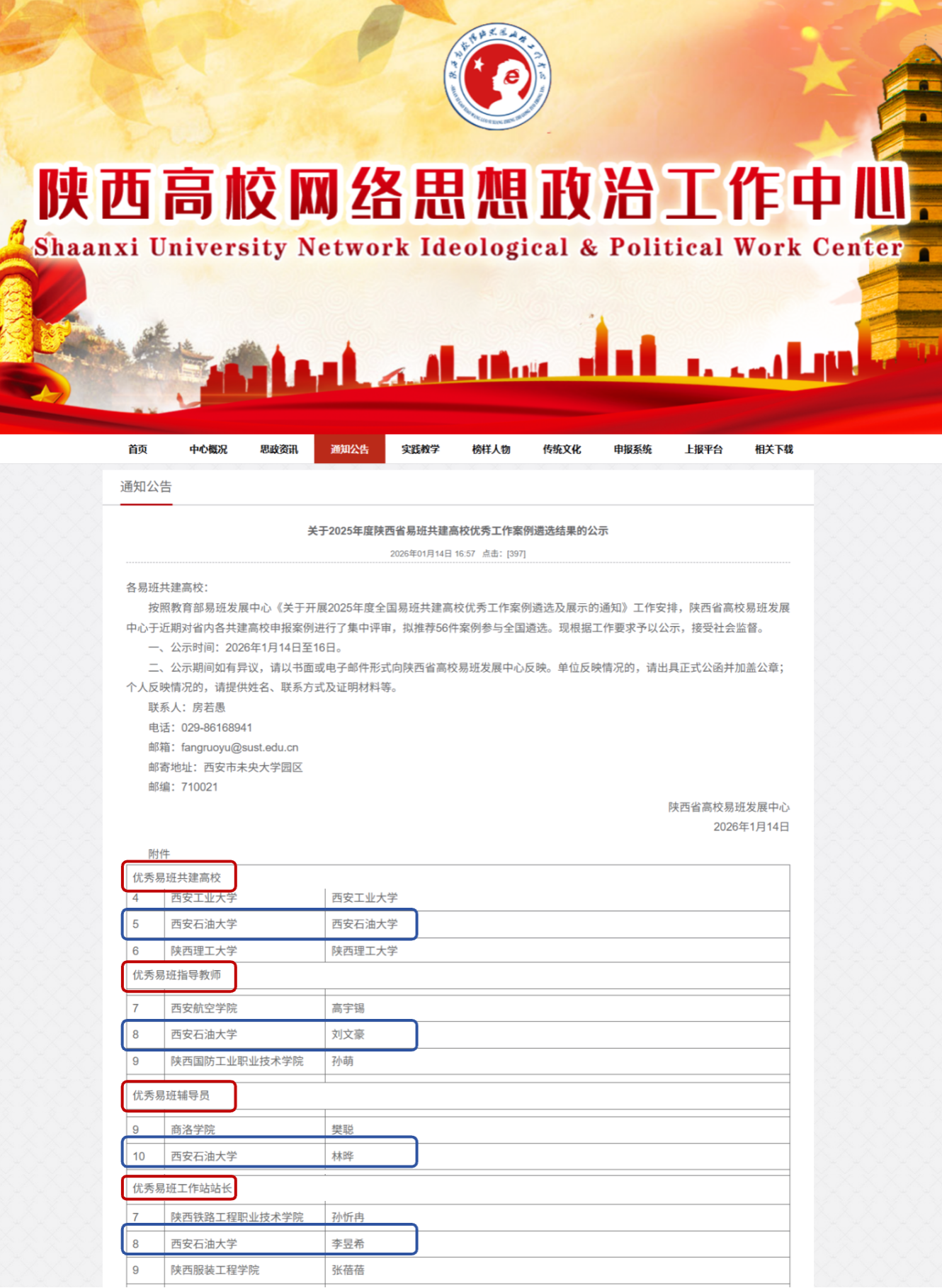 近日,陜西省高校網(wǎng)絡(luò)思想政治工作中心公布 2025 年度網(wǎng)絡(luò)思政建設(shè)評優(yōu)結(jié)果,我校易班發(fā)展中心憑借扎實的建設(shè)成效、創(chuàng)新的實踐舉措及顯著的育人實效,斬獲 “優(yōu)秀易班共建高?!?等四項省級榮譽,實現(xiàn)集體與個人獎項雙豐收,充分彰顯了學(xué)校在網(wǎng)絡(luò)思政育人體系建設(shè)中的綜合實力與鮮明特色。