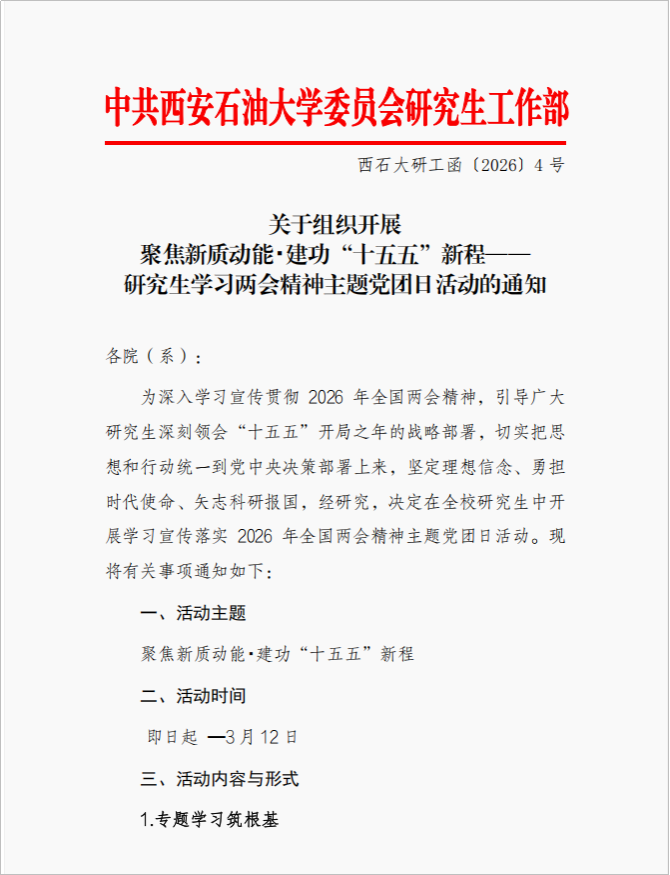 學(xué)校研究生“聚焦新質(zhì)動(dòng)能?建功‘十五五’新程”主題黨(團(tuán))日活動(dòng)覆蓋全面、形式多樣、特色鮮明,各學(xué)院緊扣活動(dòng)主線,結(jié)合學(xué)科專業(yè)特色與研究生思想科研實(shí)際,通過專題學(xué)習(xí)、研討交流、實(shí)踐踐行等形式推動(dòng)兩會(huì)精神入腦入心、見行見效,有效引導(dǎo)研究生將個(gè)人理想追求融入黨和國家事業(yè)全局,激發(fā)投身科研創(chuàng)新、科技自立自強(qiáng)、服務(wù)國家戰(zhàn)略與能源強(qiáng)國建設(shè)的使命擔(dān)當(dāng),凝聚起青春建功強(qiáng)國建設(shè)、民族復(fù)興的奮進(jìn)力量。