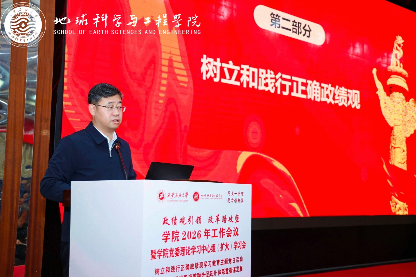 為貫徹落實學?!绑w系重塑年、質(zhì)量躍升年、改革攻堅年”建設部署,深入推進樹立和踐行正確政績觀學習教育,4月2日,地球科學與工程學院“同上一堂課 聚力譜新篇”2026年工作會議暨黨委理論學習中心組(擴大)學習會在雁塔校區(qū)舉行。會議以“政績觀引領(lǐng)、改革路攻堅”為主線,圍繞“黨建賦能強根基、產(chǎn)教融合促躍升、體系重塑謀發(fā)展”主題,通過專題思政課、專題黨課、學院工作報告、中心組學習研討及警示教育等環(huán)節(jié),凝聚發(fā)展共識,明確攻堅方向。校長王進富到會指導并為與會人員講授專題思政課和黨課。學院黨委書記高黎主持會議,學院領(lǐng)導班子成員、全體教職工及研究生代表參加會議。