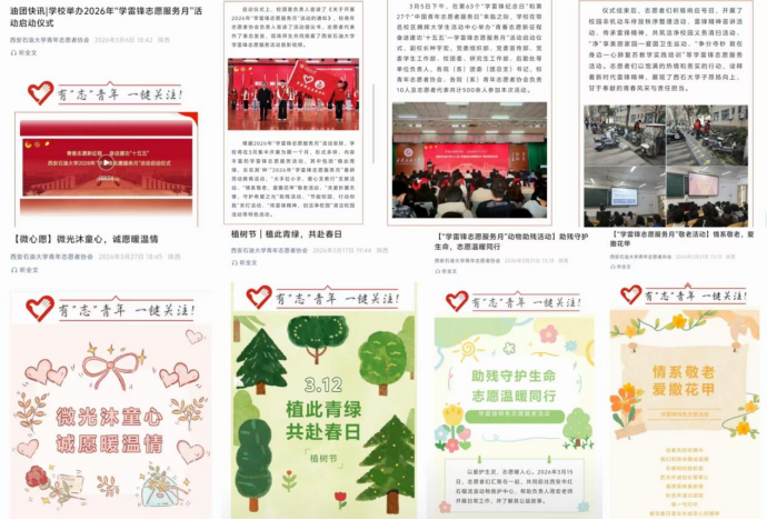 為深入學(xué)習(xí)宣傳貫徹黨的二十大和二十屆歷次全會(huì)精神,全面貫徹落實(shí)習(xí)近平總書(shū)記關(guān)于深入開(kāi)展學(xué)雷鋒活動(dòng)的重要指示精神,組織引領(lǐng)廣大青年弘揚(yáng)“奉獻(xiàn)、友愛(ài)、互助、進(jìn)步”的志愿精神,積極踐行社會(huì)主義核心價(jià)值觀,推動(dòng)我校學(xué)雷鋒志愿服務(wù)制度化、常態(tài)化、品牌化發(fā)展,根據(jù)上級(jí)團(tuán)組織相關(guān)要求,我校緊緊圍繞“青春志愿新征程 奮進(jìn)建功‘十五五’”主題,于2026年3月集中組織開(kāi)展了“學(xué)雷鋒志愿服務(wù)月”活動(dòng)。全校各級(jí)團(tuán)學(xué)組織、校院兩級(jí)青年志愿者協(xié)會(huì)積極響應(yīng),廣大青年學(xué)生積極參與,形式多樣、內(nèi)容豐富、成效顯著,營(yíng)造了崇尚奉獻(xiàn)、友愛(ài)互助的校園風(fēng)尚。