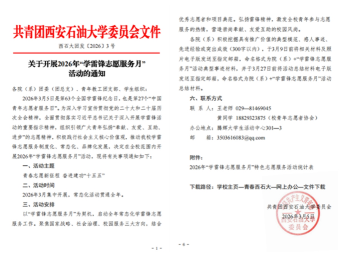 校團(tuán)委高度重視,結(jié)合學(xué)校年度工作要點(diǎn)與育人實(shí)際,于3月5日印發(fā)《關(guān)于開(kāi)展2026年“學(xué)雷鋒志愿服務(wù)月”活動(dòng)的通知》(西石大團(tuán)發(fā)〔2026〕3號(hào)),對(duì)全年特別是3月份的學(xué)雷鋒志愿服務(wù)工作進(jìn)行了系統(tǒng)安排。《通知》明確了“服務(wù)重大戰(zhàn)略、踐行為民宗旨、深入基層治理、融匯學(xué)科優(yōu)勢(shì)、厚植校園沃土”五大活動(dòng)方向,為全?;顒?dòng)開(kāi)展提供了清晰指引。各院(系)團(tuán)委、各級(jí)學(xué)生組織迅速響應(yīng),結(jié)合學(xué)科專業(yè)特色,制定了具體可行的實(shí)施方案,形成了校院聯(lián)動(dòng)、分工明確、責(zé)任到人的工作格局,確保了各項(xiàng)活動(dòng)有計(jì)劃、有步驟地扎實(shí)推進(jìn)。