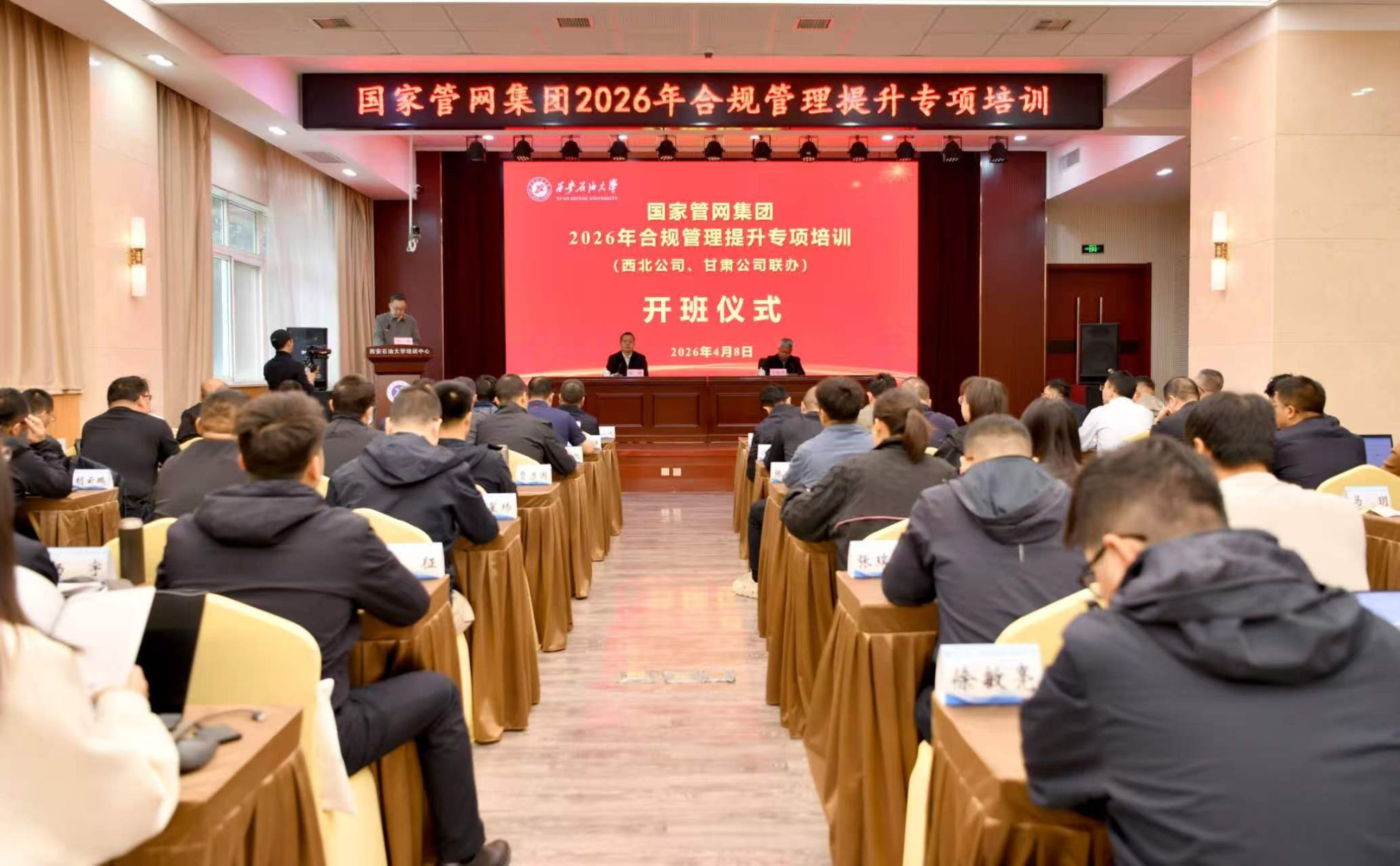 4月8日上午,由國家管網(wǎng)集團西北公司、甘肅公司聯(lián)合主辦,我校承辦的“國家管網(wǎng)集團2026年合規(guī)管理提升專項培訓”在我校明德校區(qū)順利開班。西北公司總會計師、黨委委員、首席合規(guī)官、總法律顧問陳海,我校黨委委員、副校長張驍勇出席開班儀式,儀式由西北公司綜合監(jiān)督部負責人劉俊主持。來自兩家公司合規(guī)管理、經(jīng)營管理、綜合管理部門負責人及業(yè)務骨干參加培訓。