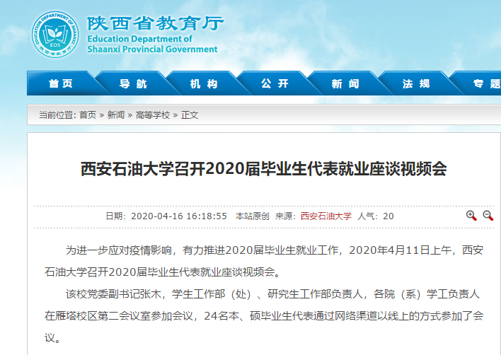 為進(jìn)一步應(yīng)對(duì)疫情影響,有力推進(jìn)2020屆畢業(yè)生就業(yè)工作,2020411日上午,西安石油大學(xué)召開(kāi)2020屆畢業(yè)生代表就業(yè)座談視頻會(huì)。