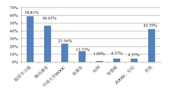 任課教師選用平臺情況:任課教師使用超星學(xué)習(xí)通、騰訊課堂、中國大學(xué)MOOC平臺的老師最多,多選比例分別為58.81%、46.65%、23.56%。