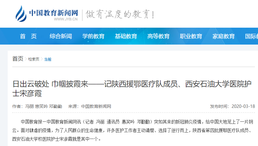 【中國教育新聞網(wǎng)】日出云破處 巾幗披霞來——記陜西援鄂醫(yī)療隊(duì)成員、西安石油大學(xué)醫(yī)院護(hù)士宋彥霞