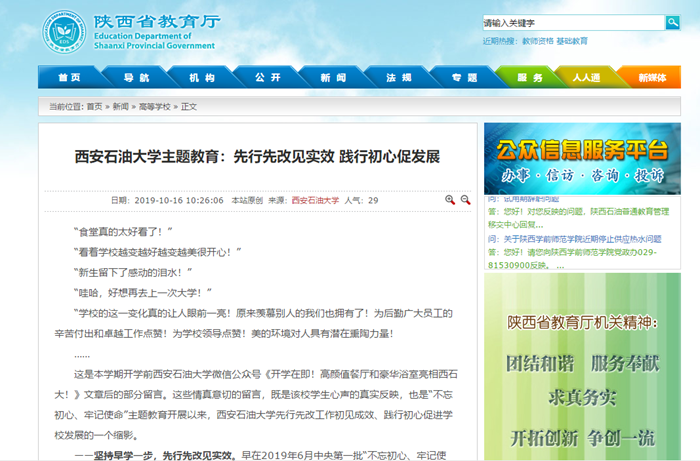 這是本學期開學前西安石油大學微信公眾號《開學在即!高顏值餐廳和豪華浴室亮相西石大!》文章后的部分留言。這些情真意切的留言,既是該校學生心聲的真實反映,也是“不忘初心、牢記使命”主題教育開展以來,西安石油大學先行先改工作初見成效、踐行初心促進學校發(fā)展的一個縮影。