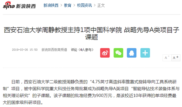 日前,西安石油大學二級教授周靜負責的“4.75英寸高造斜率推靠式旋轉導向工具系統(tǒng)研制”項目,被中國科學院重大科技任務局批復成為戰(zhàn)略先導A類項目“智能導鉆技術裝備體系與相關理論研究”的子課題。該子課題的批準經費為900萬元,是該校近10年獲得的單項經費最大的國家級科研項目。