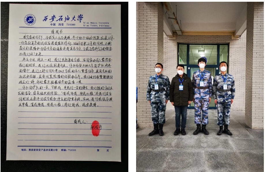 在結(jié)束讓人內(nèi)心震撼的元旦升旗的旗手任務(wù)之后,張峻宇繼續(xù)奔赴學(xué)校一線,參與了由退伍大學(xué)生組成的“學(xué)生疫情防控糾察隊(duì)”,不知疲倦地奉獻(xiàn)著自己?!拔覀円獙?duì)得起身上的這身禮服,對(duì)得起自己宣誓的那面國旗,對(duì)得起自己‘護(hù)我國旗,壯我國威’的誓言。”有了這誓言,天再冷,病毒再可怕,我們都始終相信,西石大必勝,西安必勝。