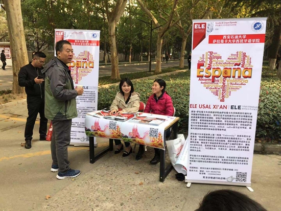 (西班牙語教師趙雨菡、意大利語教師張雨青在我校進行薩拉曼卡大學西語學院招生宣傳工作)